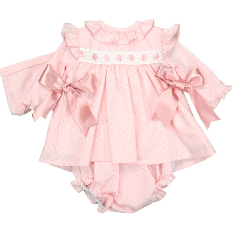 סט שמלת נקודות ורודה 3 חלקים עם סרטי פפיון תוצרת ספרד